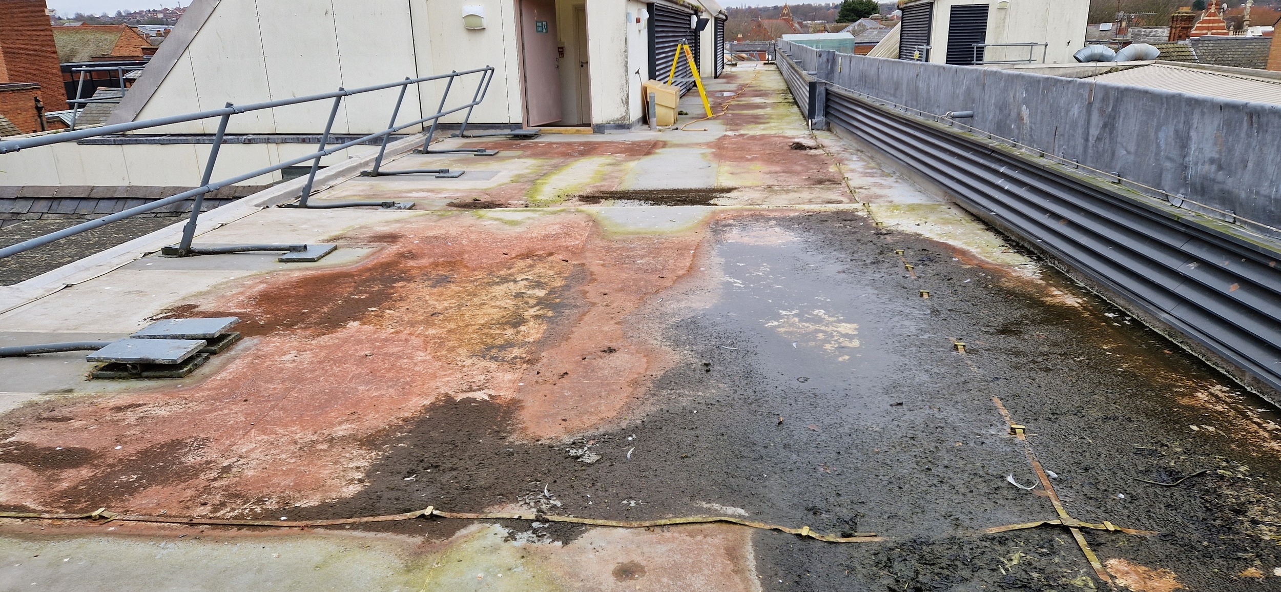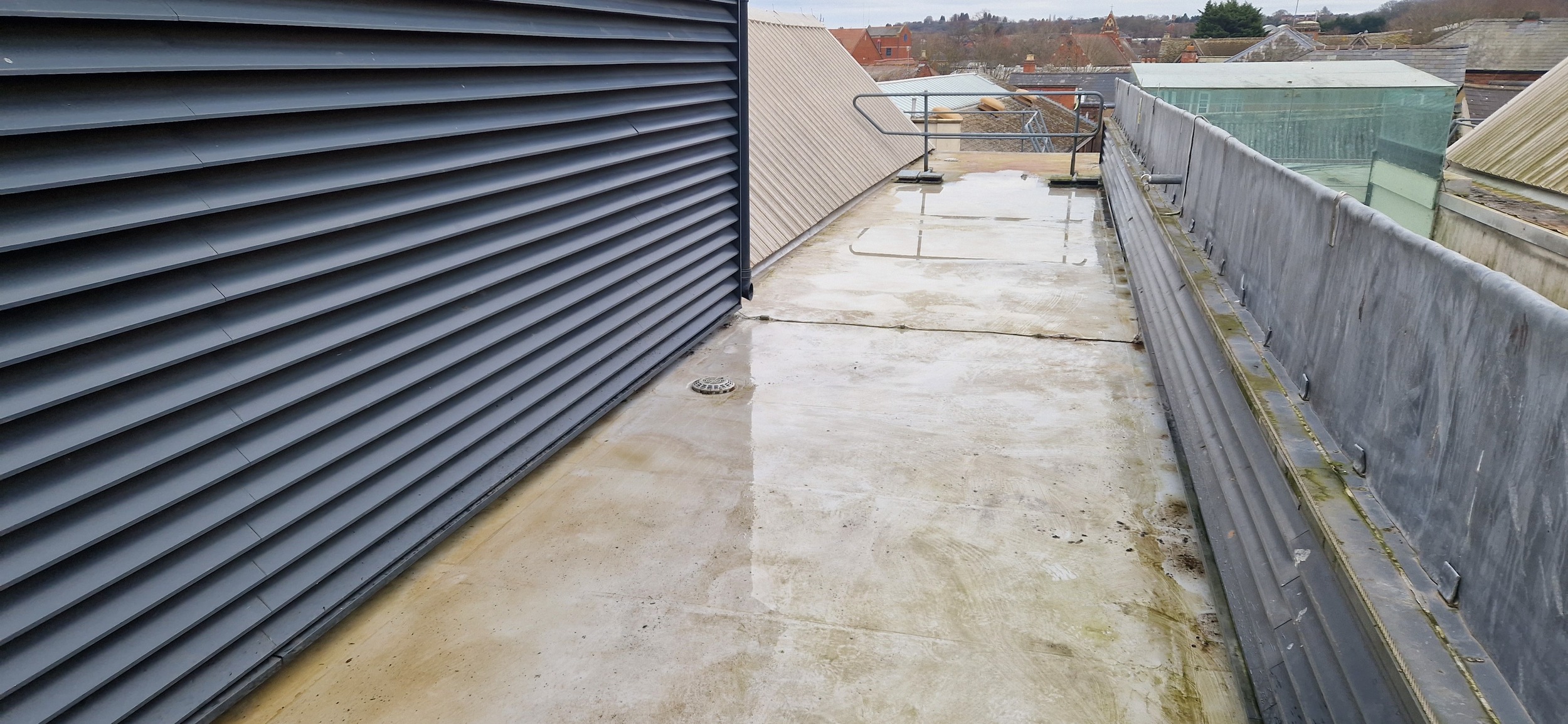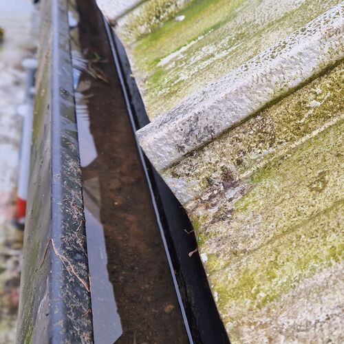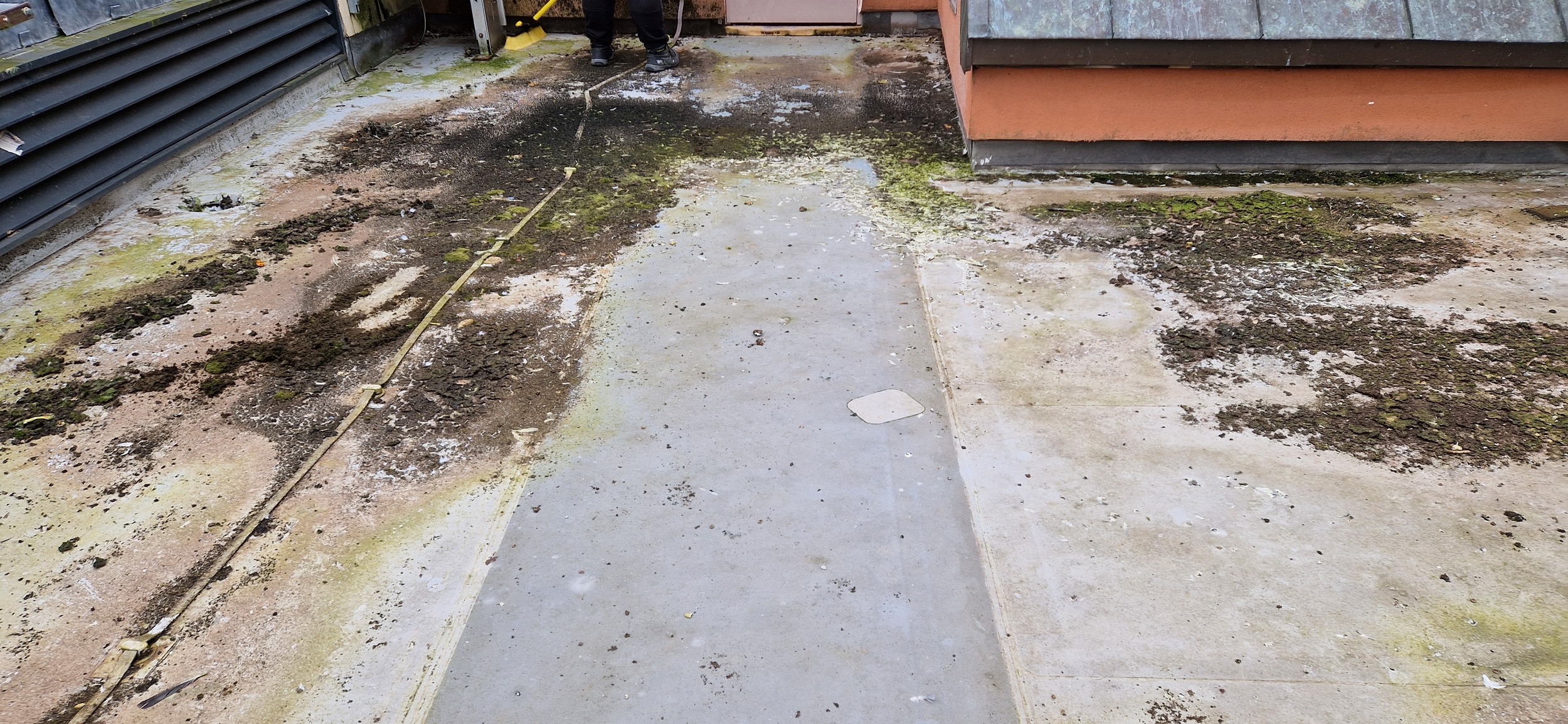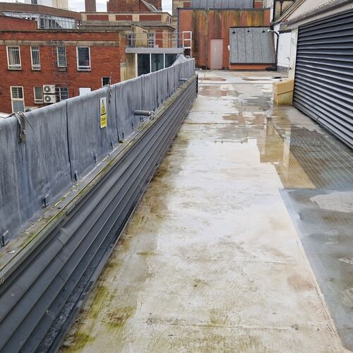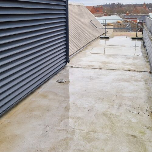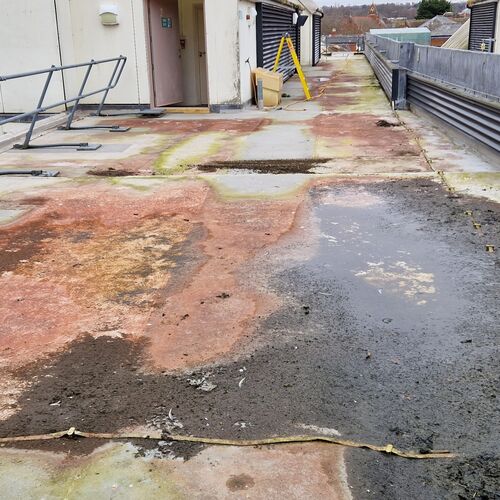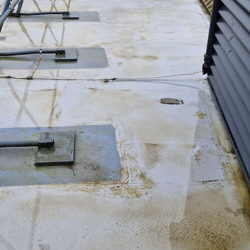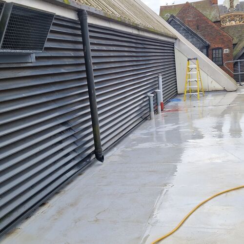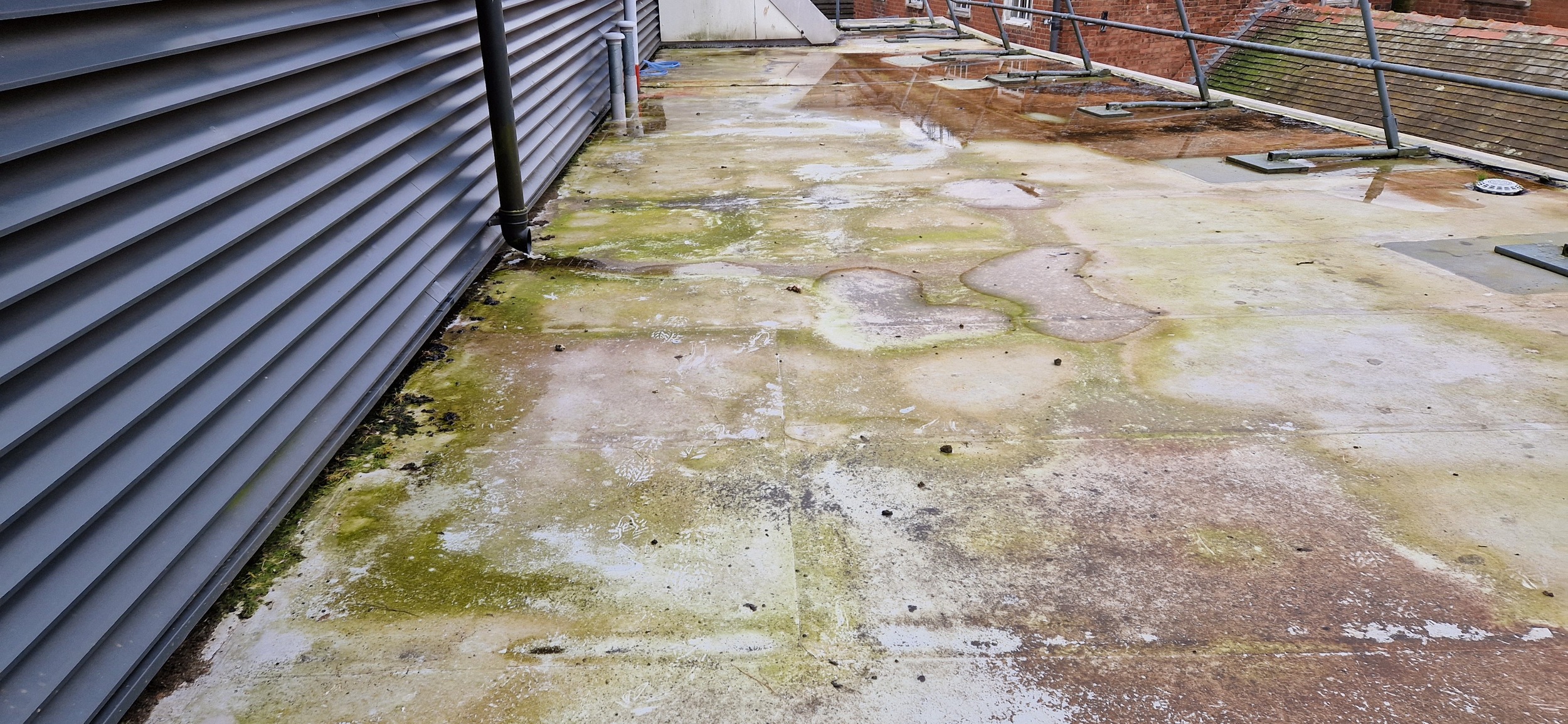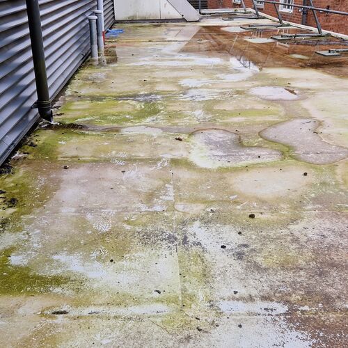 Roof and Gutter Cleaning carried out. Gutters were extremely overgrown and the roof surface was covered in slippery algae. Gutter overgrowth was removed and thoroughly cleaned out to ensure proper drainage. Roof surface was scrubbed down with a cleaning solution and water to properly remove algae and keep surfaces safe to walk on. Several punctures to the roof membrane were identified and Patch sealed.
