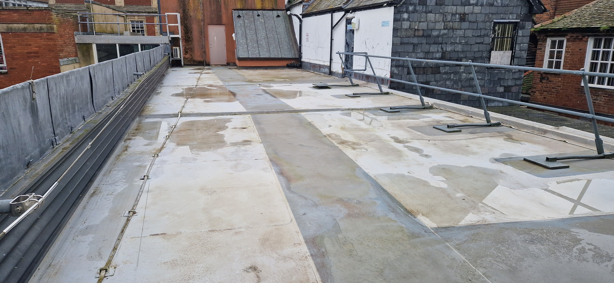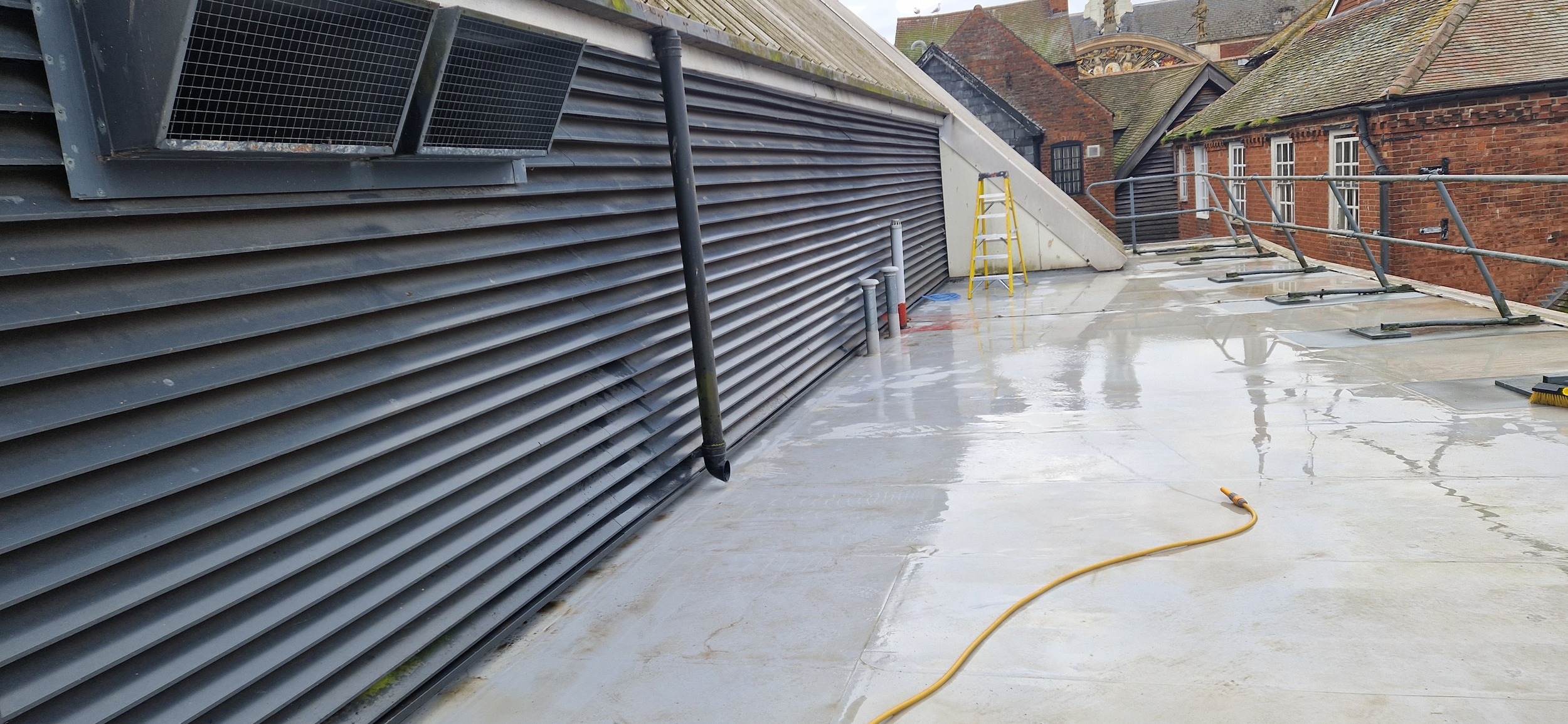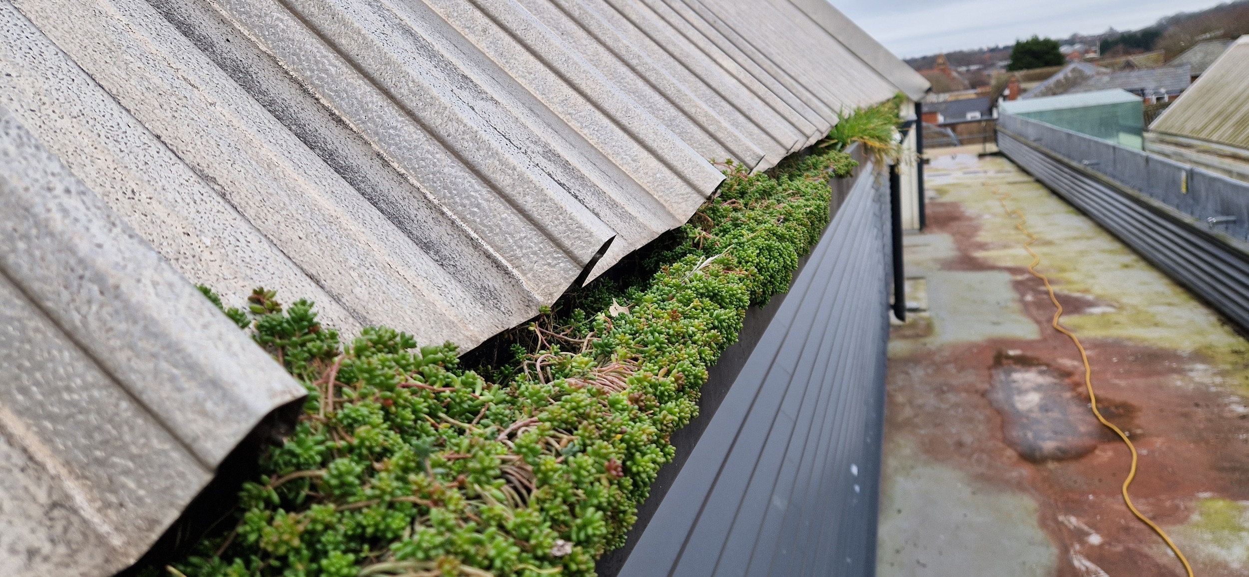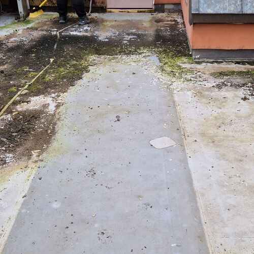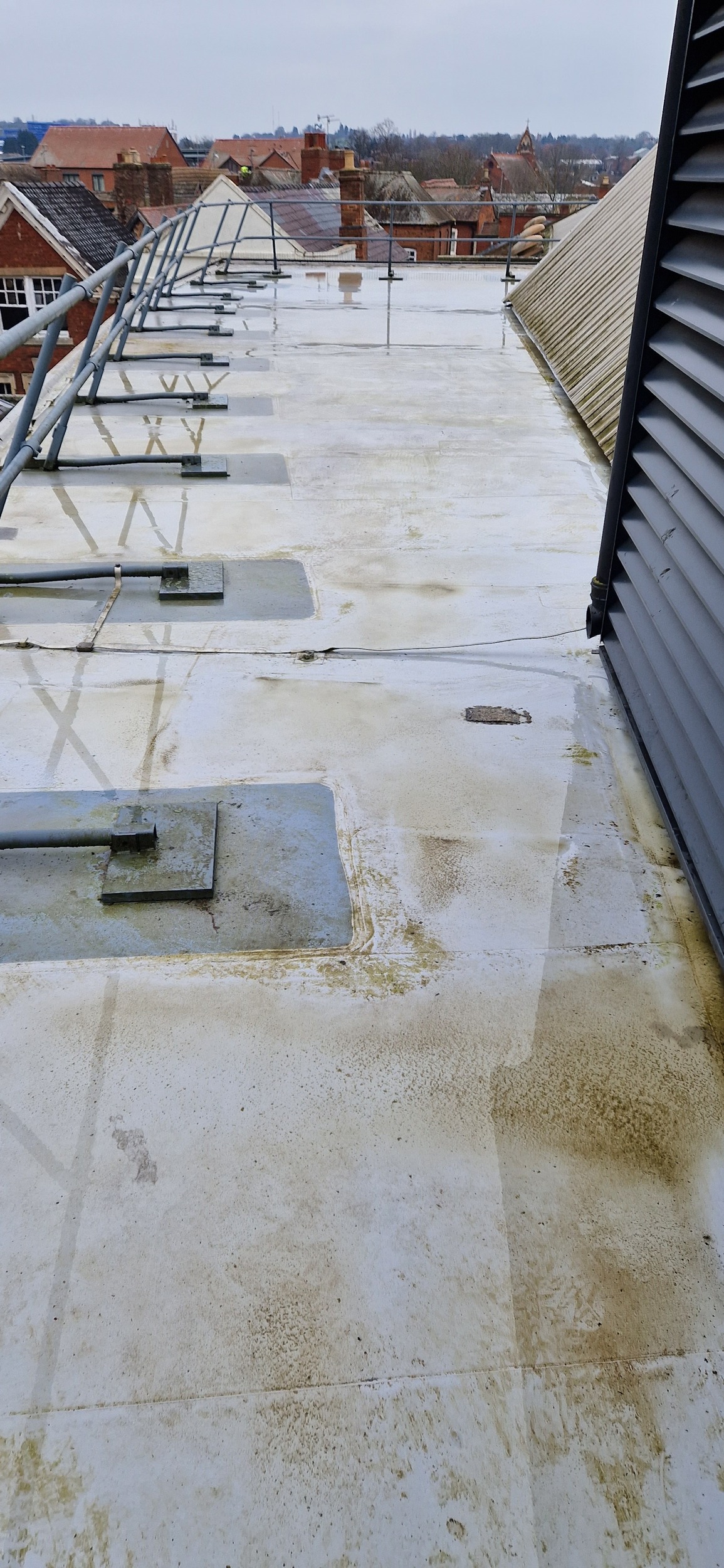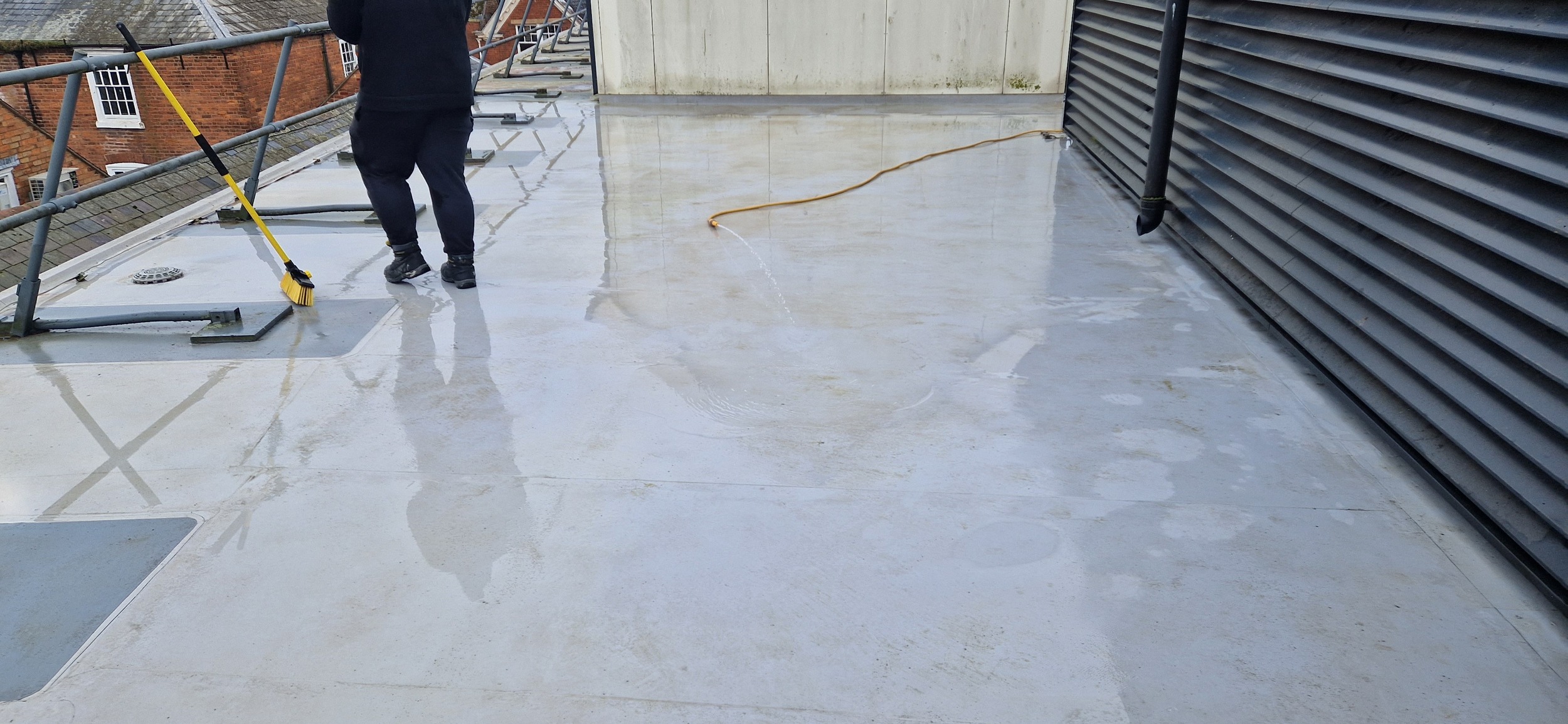 Roof and Gutter Cleaning carried out. Gutters were extremely overgrown and the roof surface was covered in slippery algae. Gutter overgrowth was removed and thoroughly cleaned out to ensure proper drainage. Roof surface was scrubbed down with a cleaning solution and water to properly remove algae and keep surfaces safe to walk on. Several punctures to the roof membrane were identified and Patch sealed.
