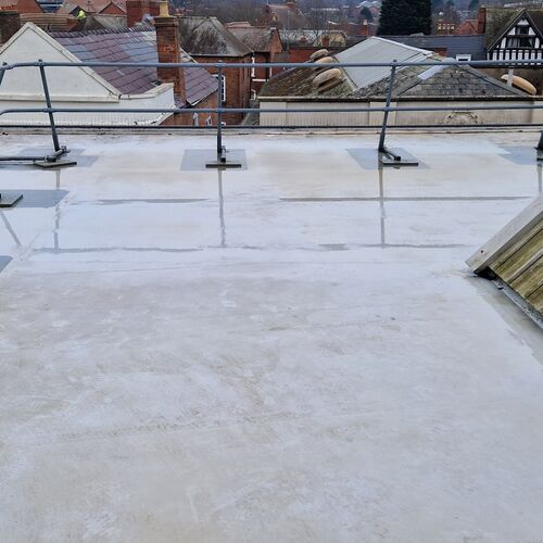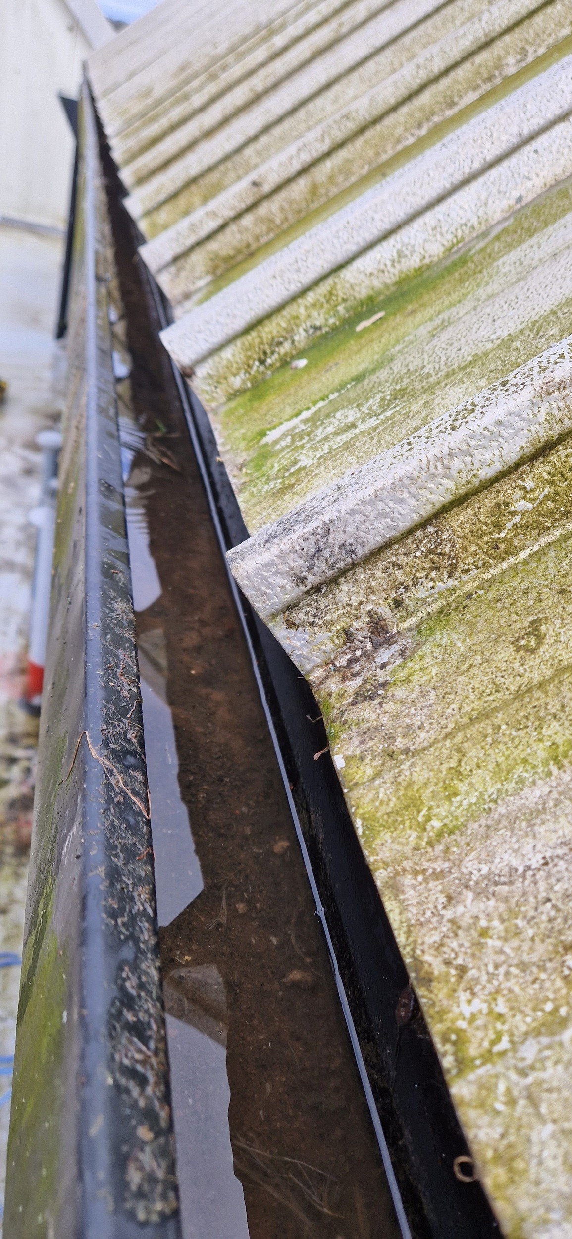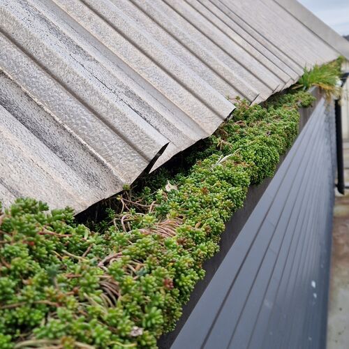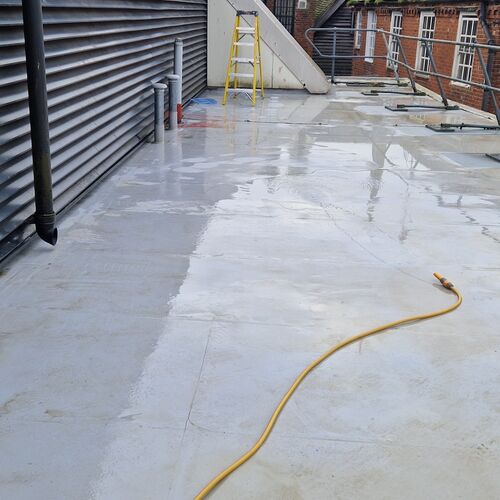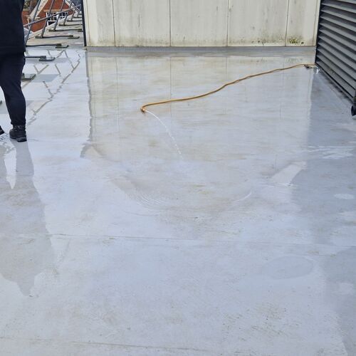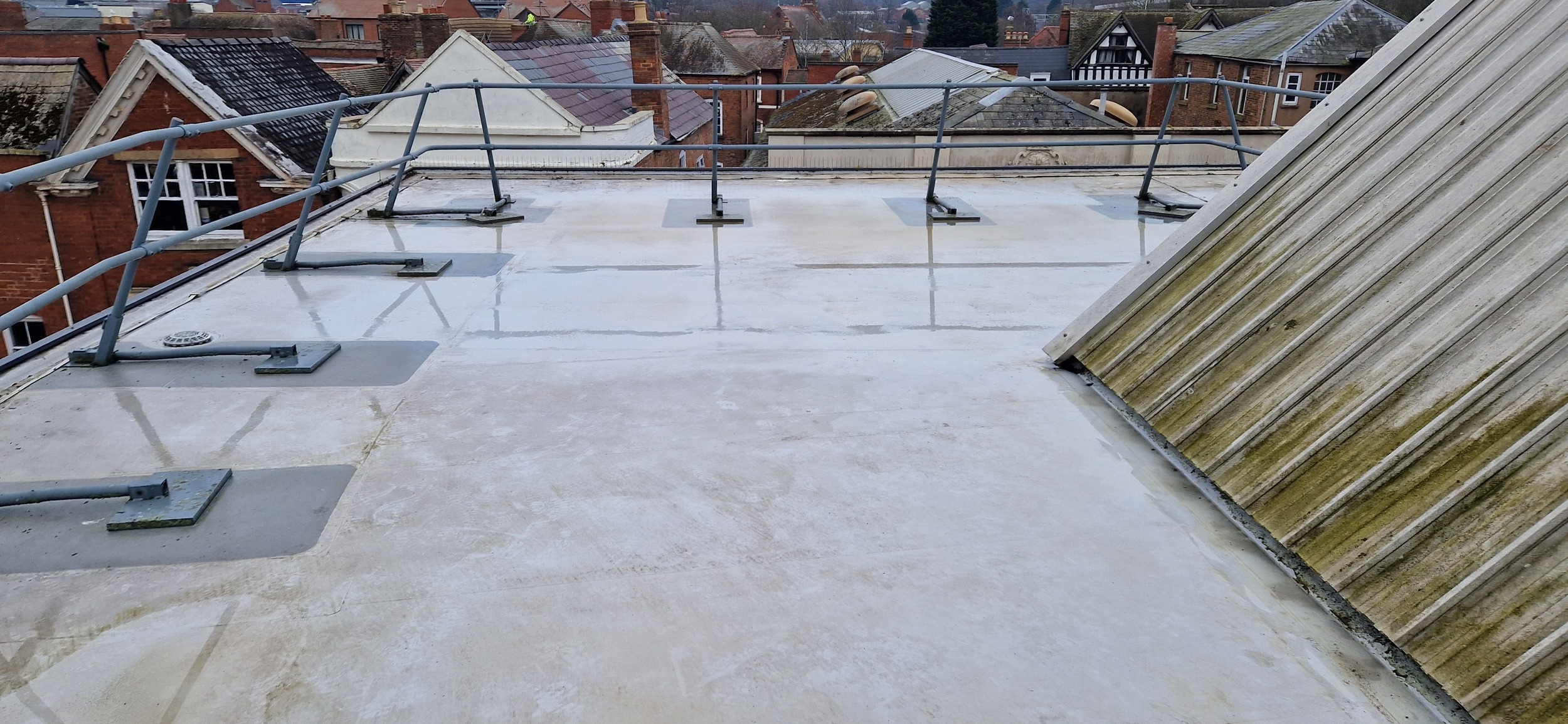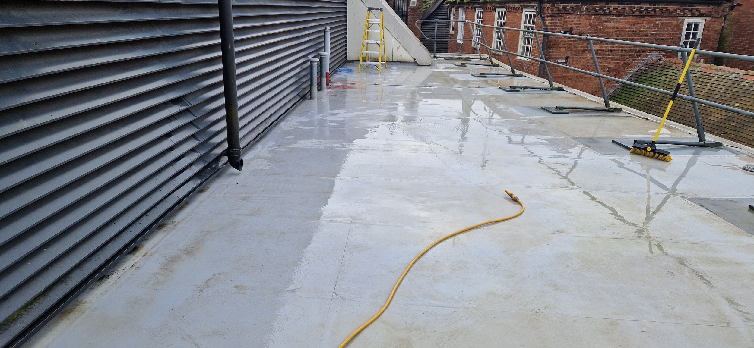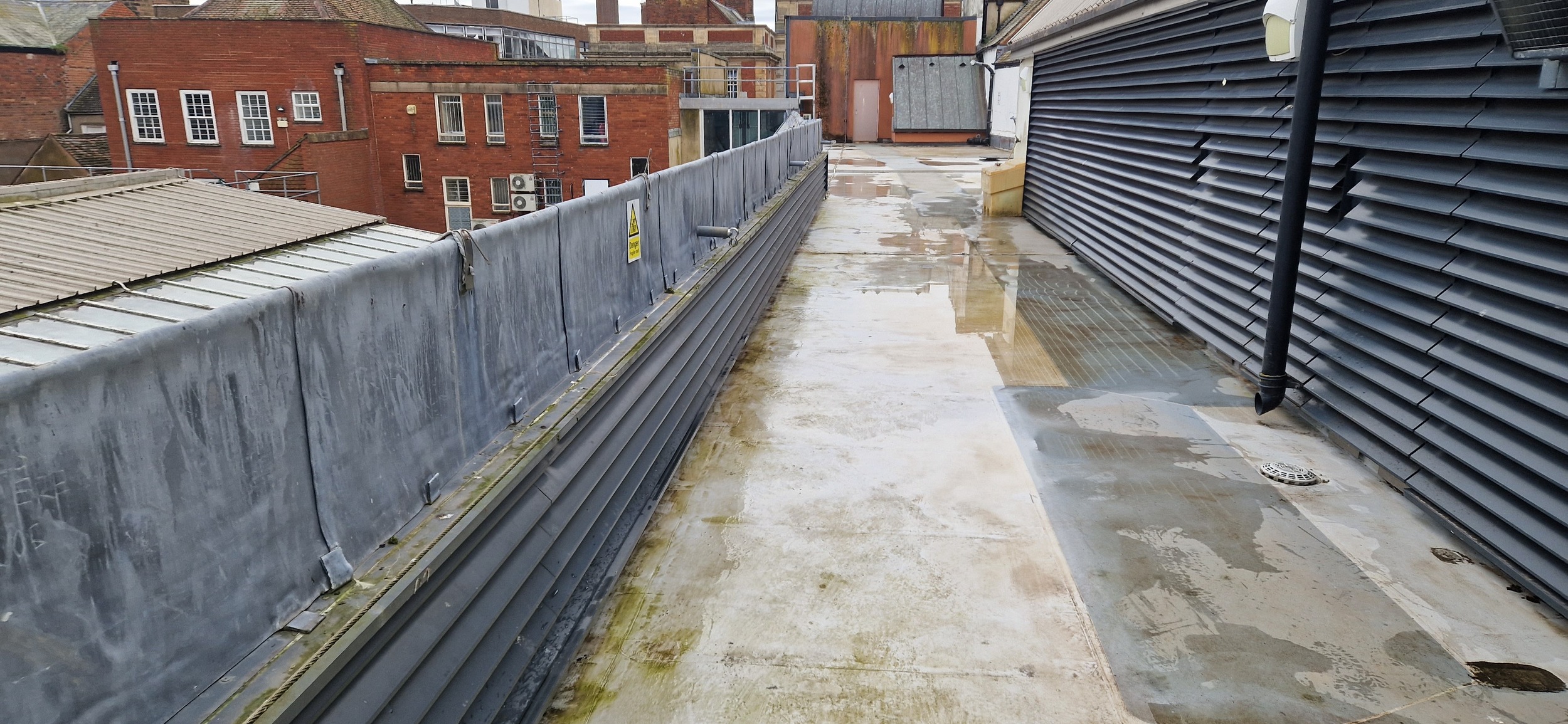 Roof and Gutter Cleaning carried out. Gutters were extremely overgrown and the roof surface was covered in slippery algae. Gutter overgrowth was removed and thoroughly cleaned out to ensure proper drainage. Roof surface was scrubbed down with a cleaning solution and water to properly remove algae and keep surfaces safe to walk on. Several punctures to the roof membrane were identified and Patch sealed.